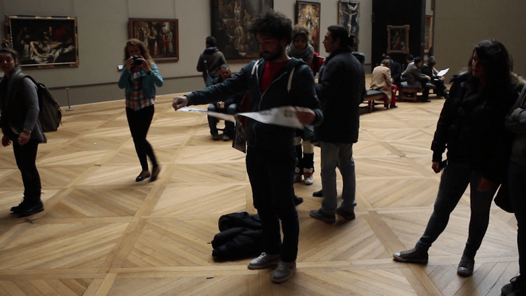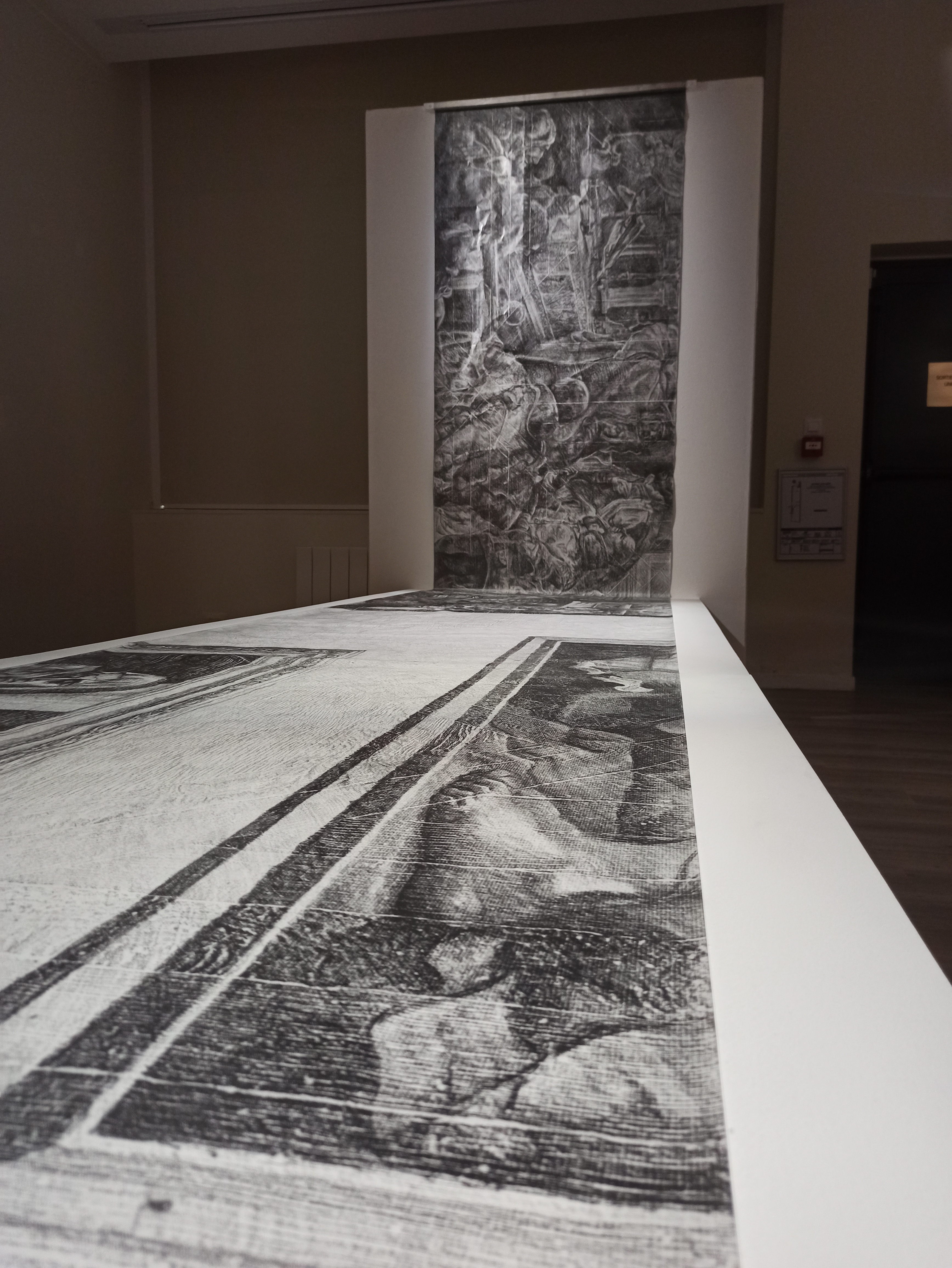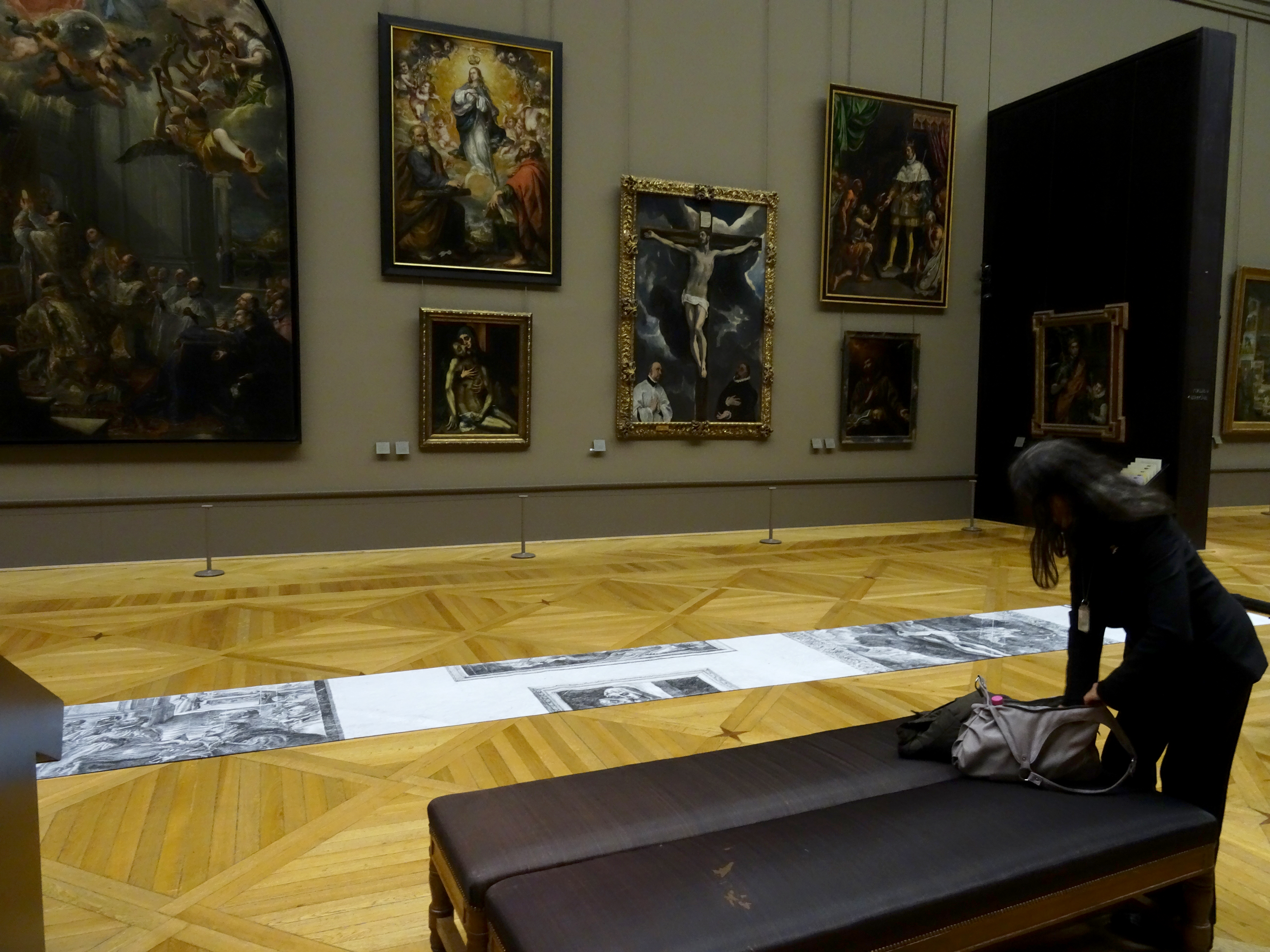 En contact avec le parquet et ses motifs, au pied des peintures que j’étudiais, j’ai progressivement développé plusieurs démarches, dont celle qui consiste à appliquer cette technique du frottage en vue de produire une empreinte du musée.