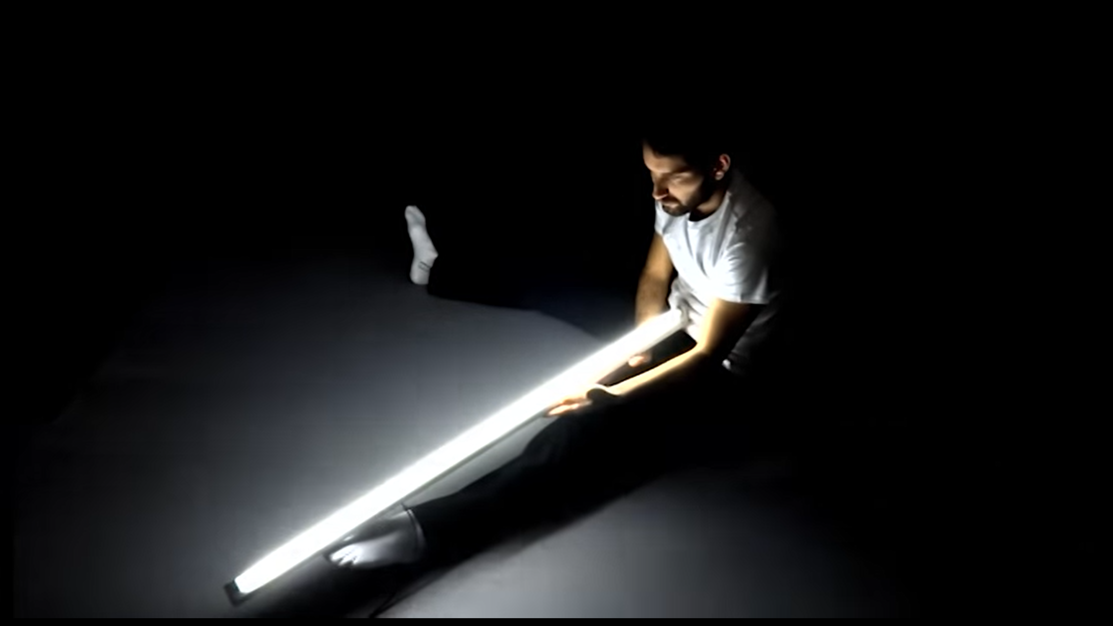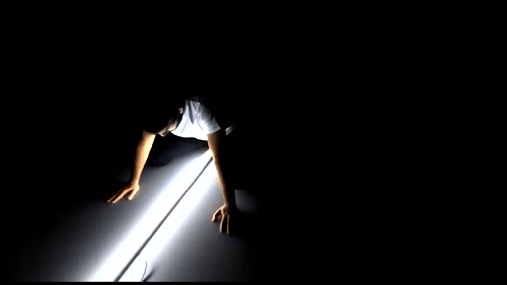 Cette série présente pour l’instant une première épreuve, celle de l’oeuvre de Bruce Nauman, Manipulating a fluorescent tube. L’emploi d’un tube fluo sous alimenté accentue les tensions entre l’objet lumineux et le corps.