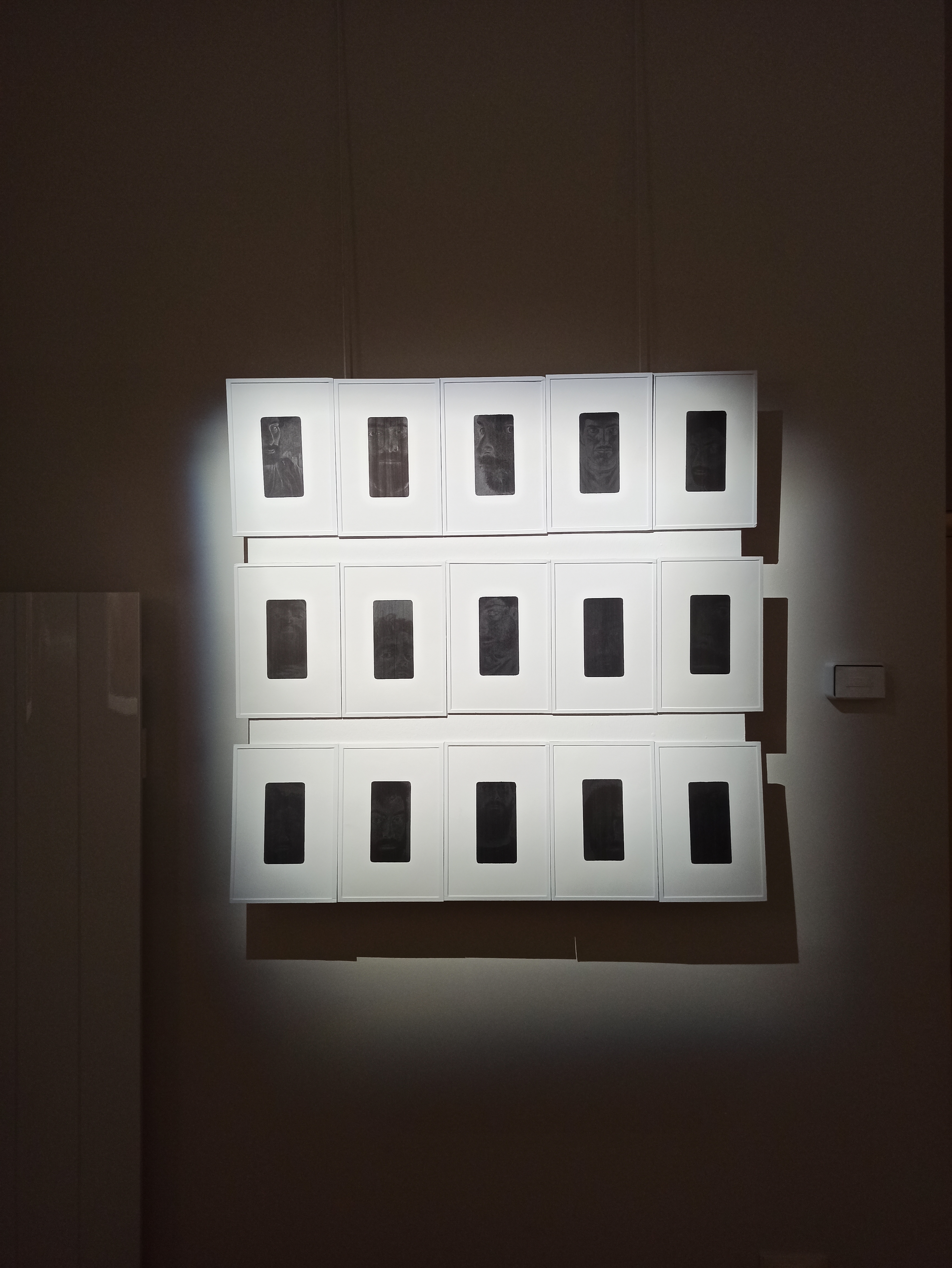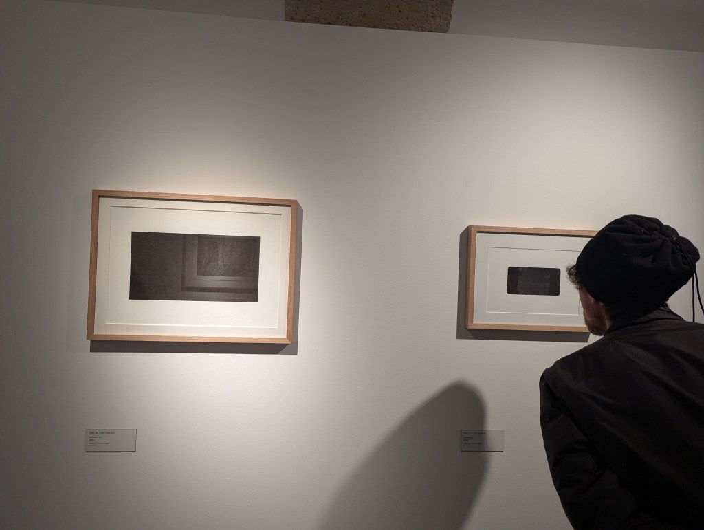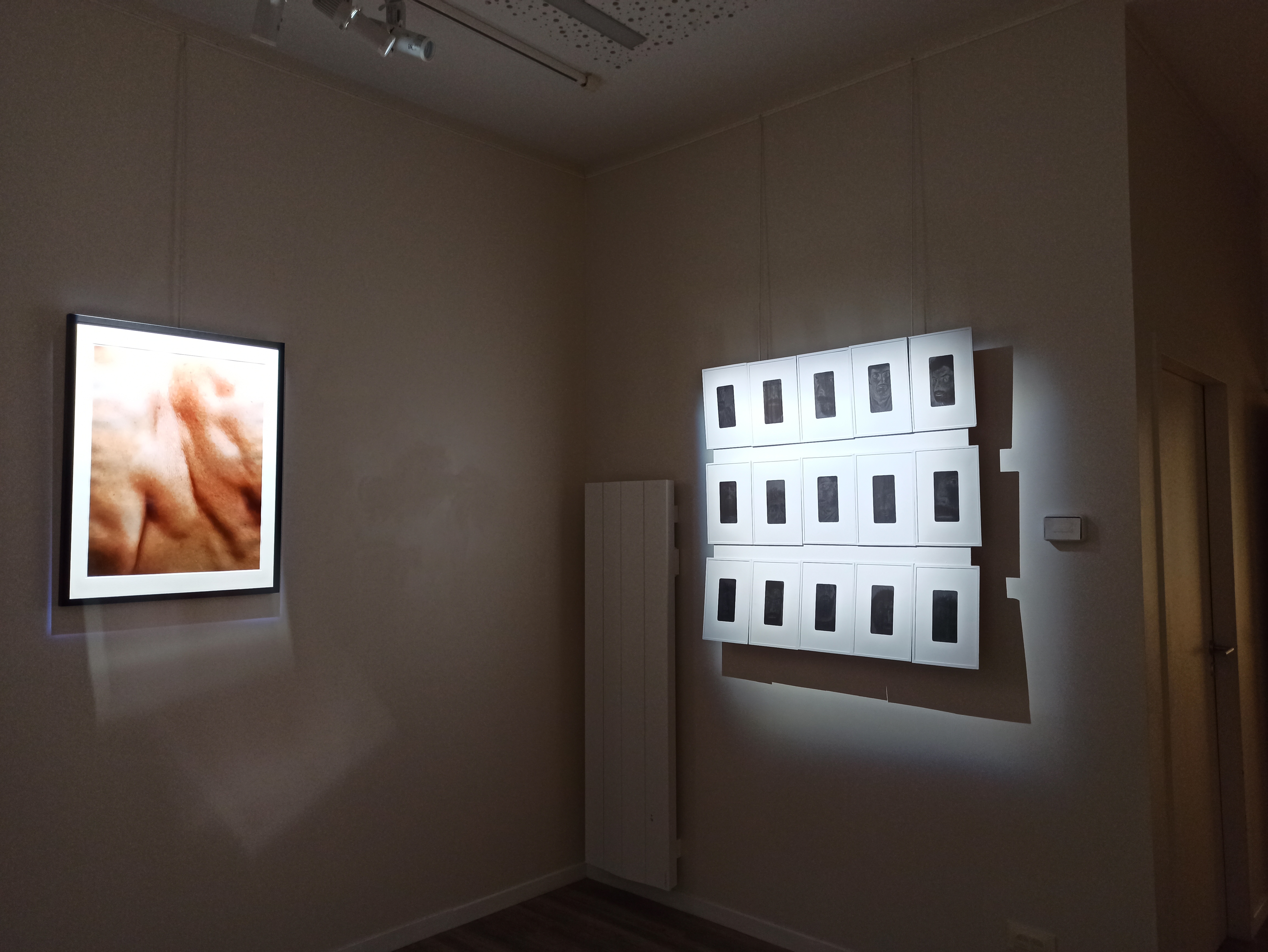 L’un des points de départ de ce projet est une expérience que, sans doute, nous avons tous faite, dans un lieu d’exposition, en présence de tableaux protégés par un verre. Nous cherchons à nous placer dans l’espace de manière à regarder le tableau en évitant d’être gêné par les reflets des éclairages. Il faut parfois se mettre de côté, plier un peu les genoux ou au contraire se hausser du mieux qu’on peut. De fait, il s’agit bien souvent de se décentrer vis-à-vis du cadre du tableau, de mettre en doute l’évidence d’un face à face avec l’oeuvre et le sujet représenté.