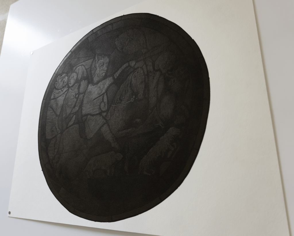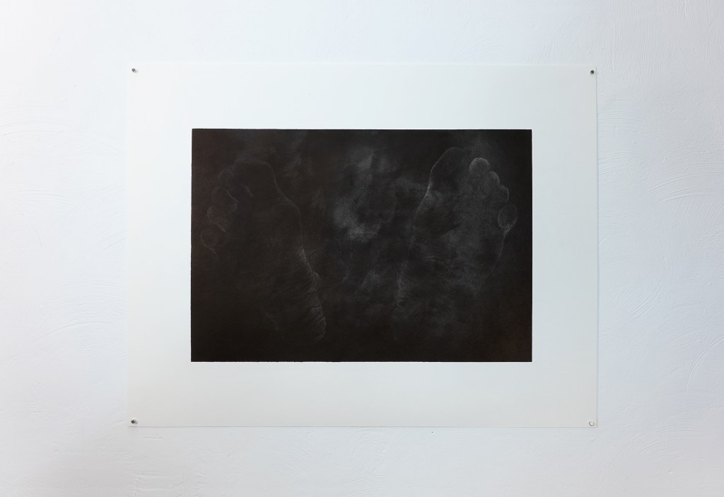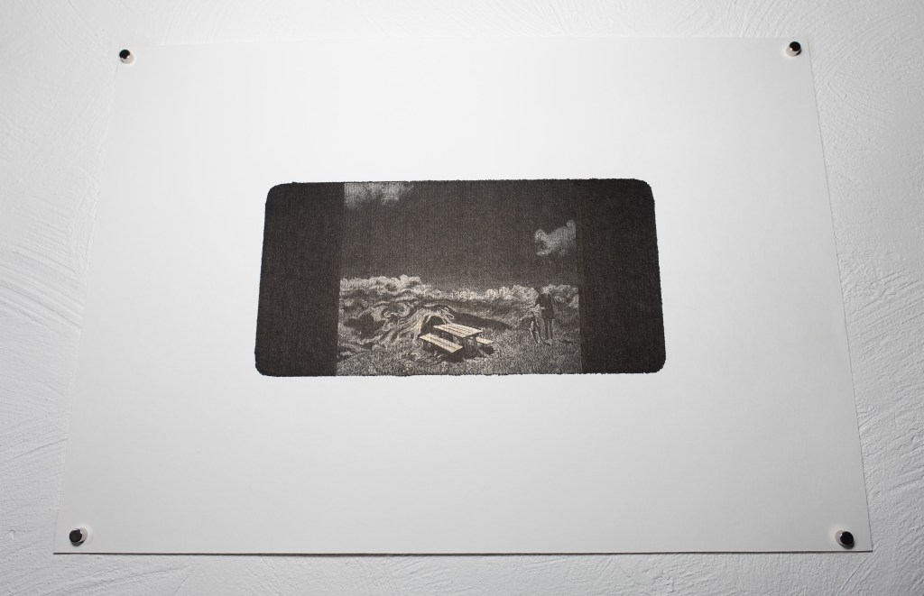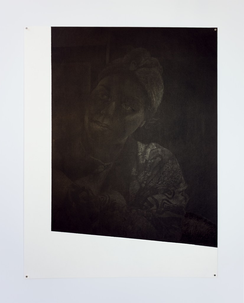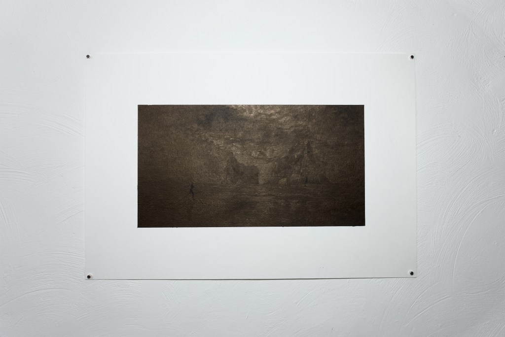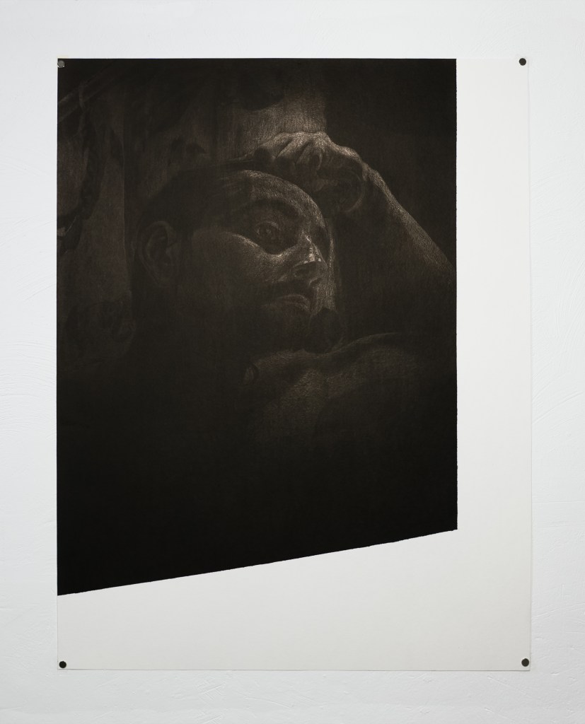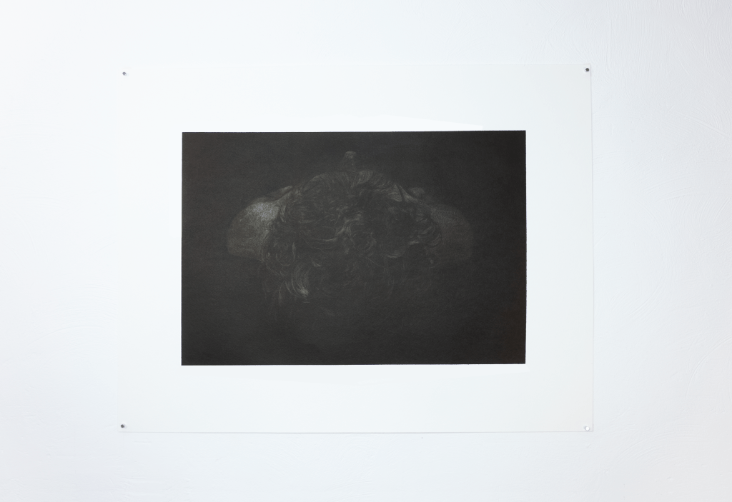 Beaucoup de ces dessins reprennent les dimensions des écrans de smartphone ou d’ordinateur portable, outils qui, lorsqu’ils sont éteints, m’ont servi de support miroir pour la réalisation des autoportraits. Les paysages sont réalisés à partir d’une documentation glanée sur internet ou nourrie par les applications de fonds d’écran. Ces représentations très codifiées, où la nature sert le plus souvent de décor à une mise en scène artificieuse de l’individu, trouvent dans ce travail un mode de présence autrement sensible.