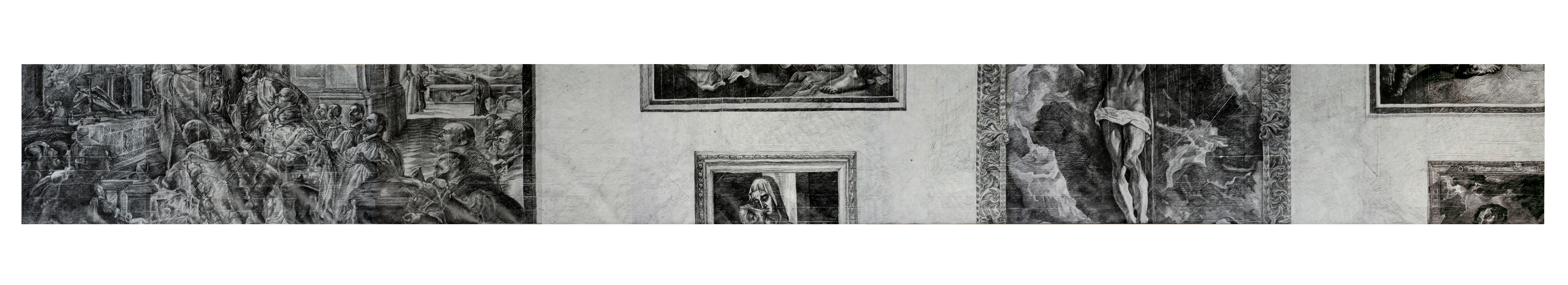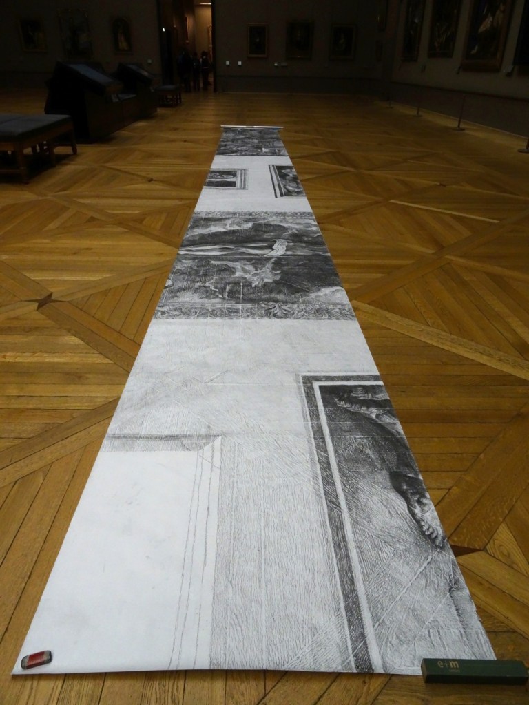 Dans le musée du Louvre, dans la salle des peintres espagnols, cette technique m’a permis de faire apparaître deux dessins, deux tracés sur une même surface de papier. Il est possible de prendre l’empreinte du sol et du mur, à des endroits où ce dernier supporte des tableaux ou expose sa propre surface nue. En préservant les échelles, je procède à une capture de ces deux plans, vertical et horizontal, à un échantillonnage de grande ampleur qui donne à voir une image de la scénographie, de l’accrochage des oeuvres, sur la trame apparente des lattes du parquet. Cette double empreinte mémorise le vis-à-vis spécifique et temporaire d’un ensemble d’oeuvres avec son lieu d’accrochage.