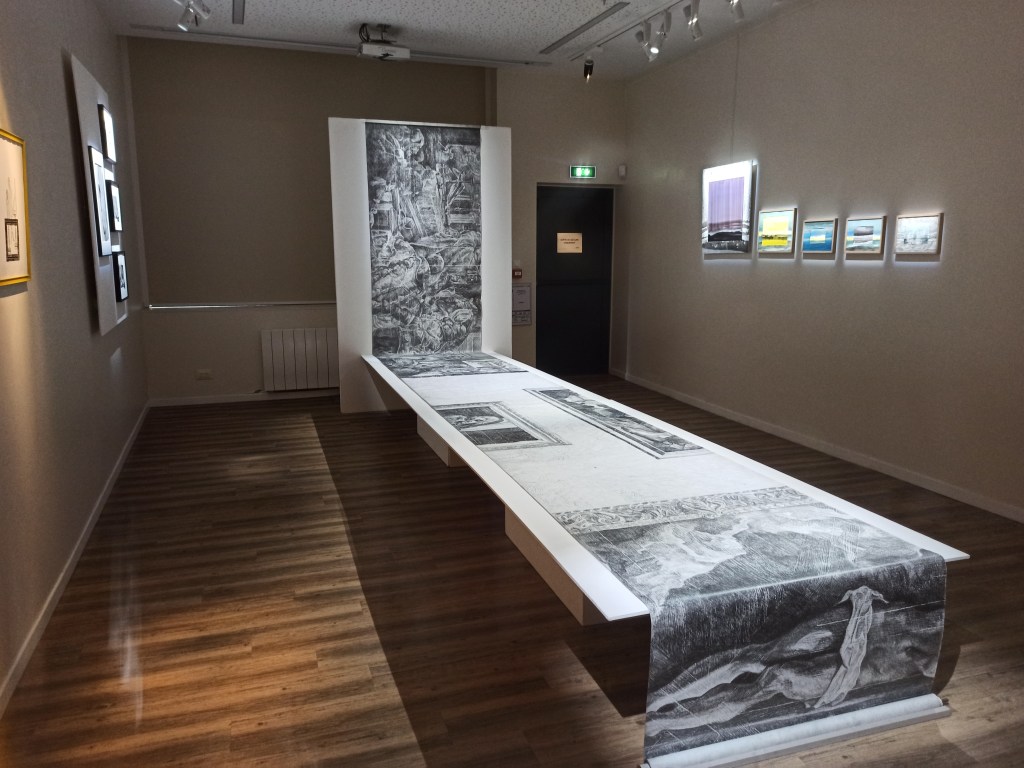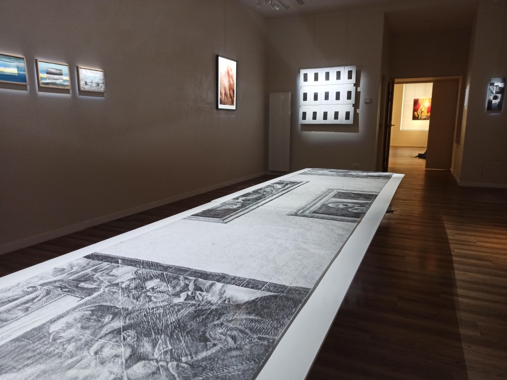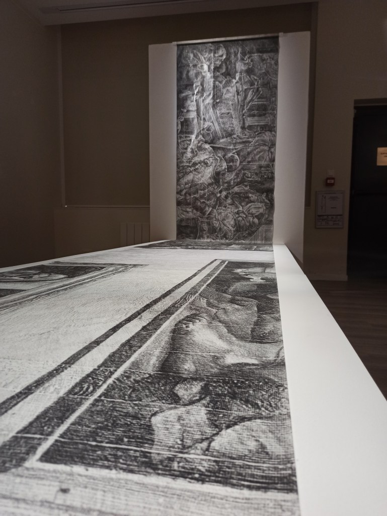 Dans mon développement personnel, comme chez bon nombre d’étudiants en art, j’ai fréquenté les musées de ma ville, je me suis exercé au dessin face aux oeuvres de l’histoire de l’art. Je me suis familiarisé avec des lieux, leurs dimensions, leurs agencements, leurs matériaux. Ma position de travail, assis par terre à dessiner sur un carnet ou sur une feuille à même le sol, me procurait un point de vue particulier sur les espaces. En contact avec le parquet et ses motifs, au pied des peintures que j’étudiais, j’ai progressivement développé plusieurs démarches, dont celle qui consiste à appliquer cette technique du frottage en vue de produire une empreinte du musée.